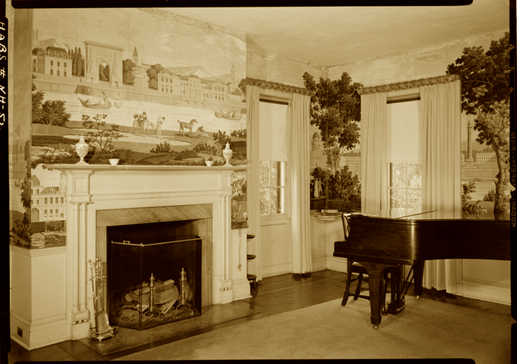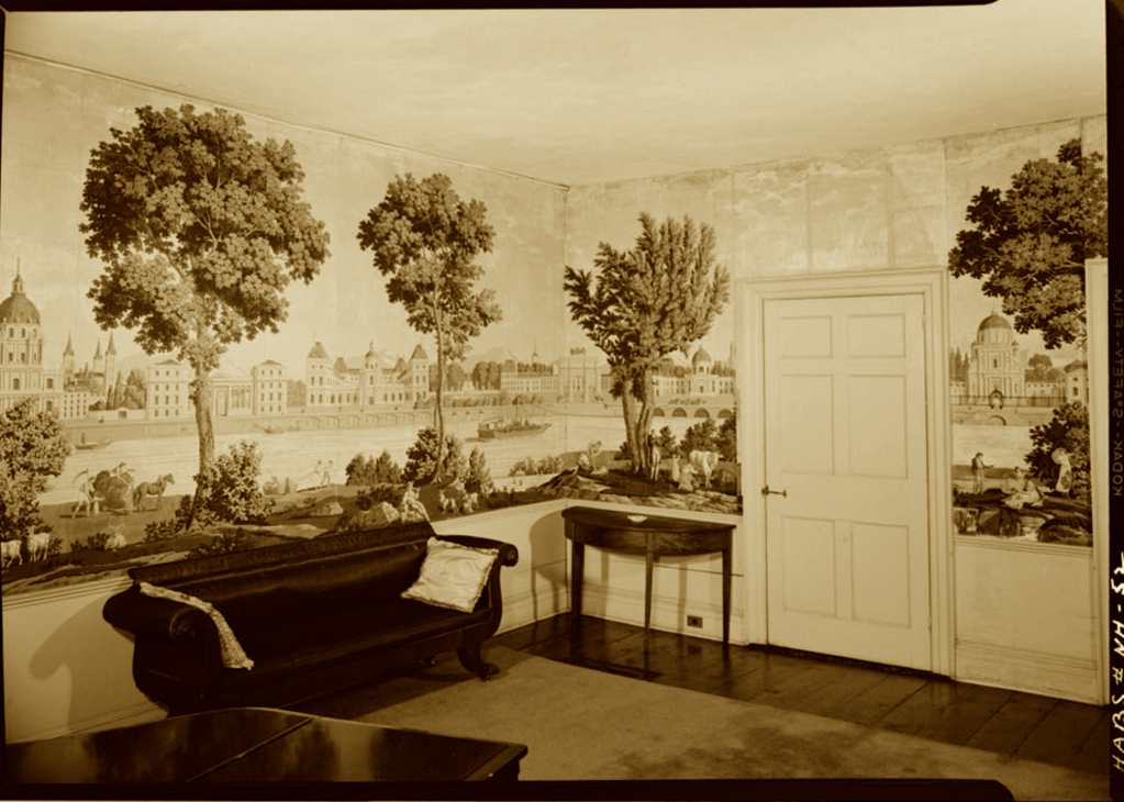 The interior retains notable early decorative features, including original stenciling in the front hall and a parlor adorned with a rare panoramic wallpaper made by Manufacture Papiers Peints Zuber et Cie of Rixheim, France, called Eldorado, created in 1848. This imported French scenic paper (hand-printed from carved woodblocks) was a luxury item in its day, and its imaginative landscape of lush foliage, distant mountains, and romantic ruins adds a layer of artistic distinction to the house. Surviving original Zuber panoramas are uncommon, though the original wood blocks survive and Zuber’s nineteenth-century panoramic wallpapers are still produced at great expense. Its presence here reflects both the refinement and the aspirations of the home’s mid-nineteenth-century occupants.