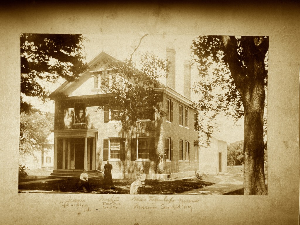 Photograph of the house c. 1896 courtesy of Jane Cahalane Woodard. Pictured, left to right: Jennie Maria Spaulding (1863-1929) (owner); Martha Cobb (1835-1909) (Jennie’s mother); a Miss Danlap (a hired nurse), holding Marion Caroline Spaulding (1896-1984) (Jennie’s daughter and the mother of Jane Cahalane Woodard (1922-2009)).